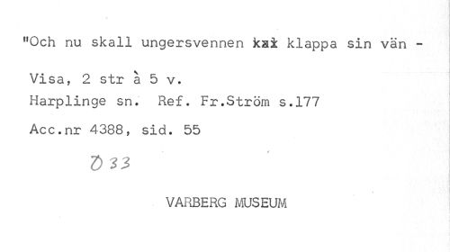 //// "Och nu skall ungersvennen kai klappa sin vän - //// Visa, 2 str a 5 v. //// Harplinge sn. Ref. Fr.Ström s.177 //// Acc.nr 4388, sid. 55 //// T> //// VARBERG MUSEUM ////