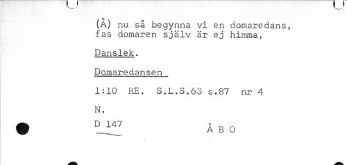 //// (A) //// nu sa begynna vi en domaredans, fas domaren själv är ej himma, //// Danslek. Domaredansen //// 1:10 RE. S.L.S.63 s.87 nr 4 //// N. //// D 147 ÅBO ////