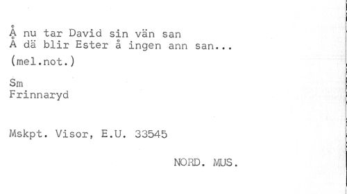 //// c //// A nu tar David sin vän san A dä blir Ester å ingen ann san... //// (mel.not.) , //// Sm [ //// Frinnaryd //// Mskpt. Visor, E.U. 33545 j //// i //// NORD. MUS. ////