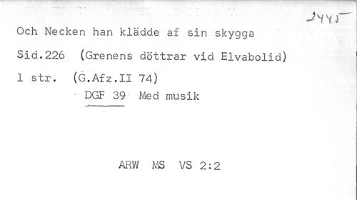 //// - » * - •• - - - ~ , „ //// Jhh r~ //// Och Necken han klädde af sin skygga //// Sid.226 (Gre nens döttrar vid Elvabolid) j //// 1 str. (G.Afz.II 74) //// - DGF 39- Med musik //// r //// I //// ARW MS VS 2:2 ////