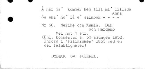 //// A när ja kommer hem till mi lillade //// Anna //// ^ Sa ska' ho' få e' salmbok ~ - - - //// Nr 60, Nerike och Kumla. Dbk //// och Hardemo //// Mel not 3 str. (Enl. kommentar s. 53 sjungen 1852. Införd i "Filikromen" 1853 med en del felaktigheter) //// DYBECK SV FOLKMEL. //// V. > w .-iV' - ___• ___ ___-»___¦*•. A. ... v \___ . _-.» A -VI -_ . . ___. . ___ _-___ ////