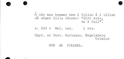 //// O //// A när man kommer hem i fyllan a i villan då säger lilla vännen: "ditt svin, //// du ä full,fV. //// s. 233 v Mel. not. 1 str. //// Uppt. av Gust. Mattsson, Engelsberg //// Vstmlnd //// MUS AK FOLKMEL. ////