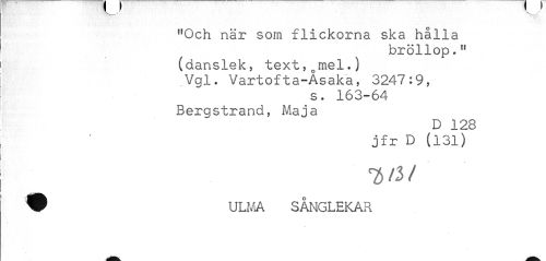 //// v___.y //// "Och när som flickorna ska hålla //// bröllop." //// (danslek, text, t>mel.) . Vgl. Vartofta-Asaka, 3247:9, //// s. 163-64 Bergstrand, Maja //// D 128 jfr D (131) //// W ULMA SÅNGLEKAR ////