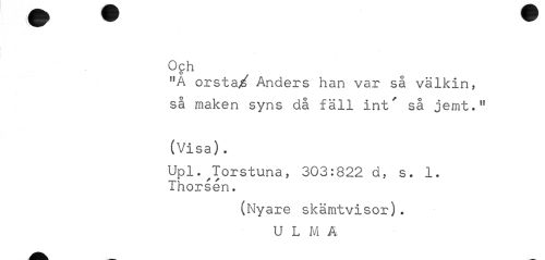 //// Och //// f,A orstaji Anders han var så välkin, så maken syns då fäll int' så jemt." //// (Visa). //// Upl.Jorstuna, 303:822 d, s. 1. Thorsén. //// (Nyare skämtvisor). U L M A- ////