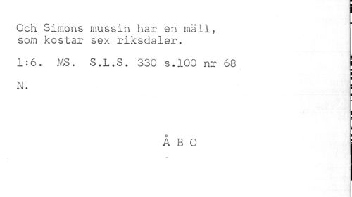 //// ¦ //// Och Simons mussin har en mall. som kostar sex riksdaler. //// 1:6. MS. S.L.S. 330 s.100 nr 68 j //// n. i //// I i //// i //// ÅBO //// .••i //// i ////