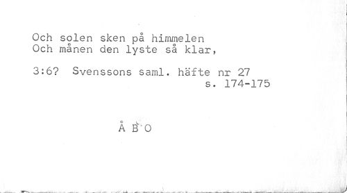 //// Och solen sken på himmelen Och månen den lyste så klar, //// 3:6? Svenssons saml. häfte nr 27 //// s. 174-175 //// Å eT O //// *rr"- , __ -___ ----------_ --- ------ ---^ ////