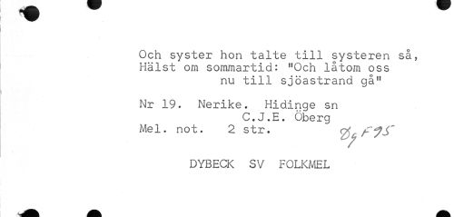 //// Och syster hon talte till systeren så, Hälst om sommartid: "Och låtom oss //// nu till sjöastrand gå11 //// Nr 19- Nerike. Hidinge sn //// C.J.E. Öberg Mel. not. 2 str. fåcfJf //// DYBECK SV FOLKMEL ////