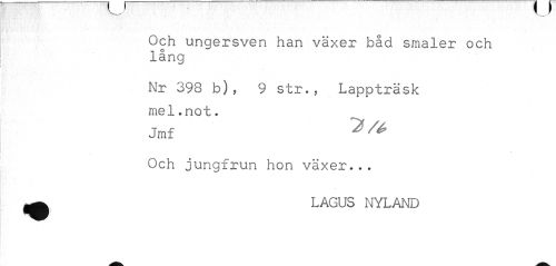 //// v,___S //// Och ungersven han växer båd småler och lång //// Nr 398 b), 9 str., Lappträsk mel.not. //// Jmf //// Och jungfrun hon växer... ^ LAGUS NYLAND ////