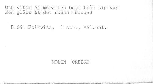 //// Och viker ej mera sen bort från sin vän Men qläds at det sk ona förbund //// B 69, Folkvisa, 1 str., Mel.not. //// MOLIN ÖREBRO //// ,---Mf-»-»----,---------------V---------^---.---,--- - - -- ////
