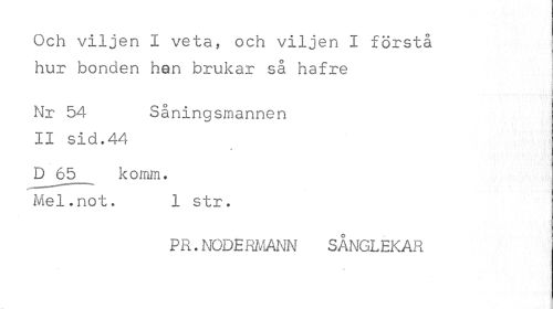 //// Och viljen I veta, och viljen I förstå hur bonden han brukar så hafre //// Nr 54 Såningsmannen //// II sid.44 //// Dj35 k o mm. Mel.not. 1 str. //// PR.NODERMANN SÅNGLEKAR //// • -t ////
