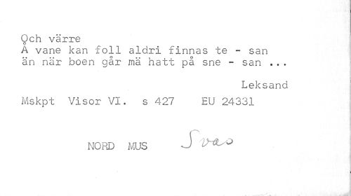 //// Och värre //// o //// A vane kan foll aldri finnas te - san än när boen går mä hatt på sne - san ... //// Leksand //// Mskpt Visor VI. s 427 EU 24331 //// NORD MUS J ° ////