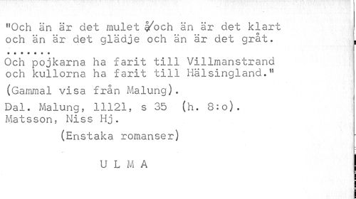 //// nOch än är det mulet |/och än är det klart //// och än är det glädje och än är det gråt. . //// 9 w ¦ v v v w //// Och pojkarna ha farit till Villmanstrand och kullorna ha farit till Hälsingland." //// (Gammal visa från Malung). //// Dal. Malung, 11121, s 35 (h. 8:o). Matsson, Niss Hj. //// (Enstaka romanser) //// U L M A j ////