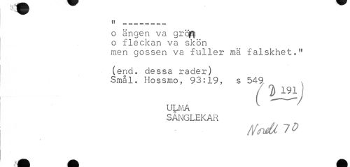 //// 1 v //// I! ___ //// o ängen va grqftt o fleckan va skön //// men gossen va fuller mä falskhet." (end. dessa rader) //// Smål. Hossmo, 93:19, s 549 //// / T) ml //// ULMA //// SÅNGLEKAR //// AfmeU 7 0 //// ¦ k å m fl B ////