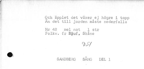 //// ¦ //// Och äpplet det växer ej högre i topp //// An det till jorden måste nederfalla //// _ //// Nr 48 mel not 1 str //// Folkv. fr Bguf, Skåne //// ^ SANDBERG SANG DEL 1 //// i ////