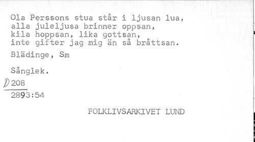 //// Ola Perssons stua står i ljusan lua, alla juleljusa brinner oppsan, //// kila hoppsan, lika gottsan, ä //// inte gifter jag mig än så bråttsan. //// Blädinge, Sm Sånglek. //// J) 208 //// 2893:54 //// FOLKLIVSARKIVET LUND , ////