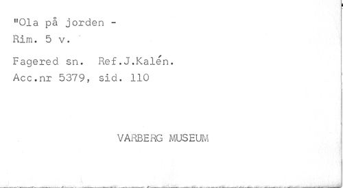 //// "Ola på jorden -Rim. 5 v. //// Fagered sn. Ref.J.Kale n. Acc.nr 5379, sid. 110 //// VARBERG MUSEUM ////