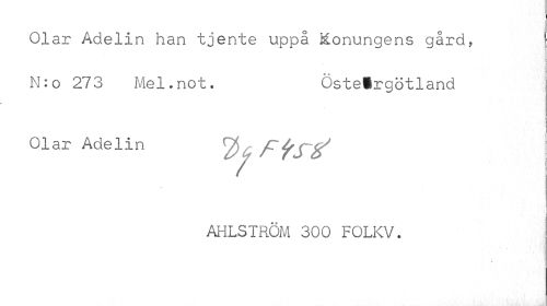 //// Olar Adelin han tjente uppå Konungens gård, N:o 273 Mel.not. Östetrgötland //// Olar Adelin 9'; F^S //// AHLSTRÖM 300 FOLKV. ////