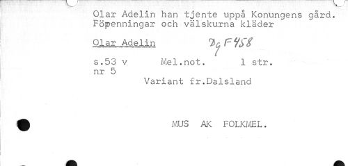 //// Olar Adelin han tjente uppå Konungens gård. Föpenningar och välskurna kläder //// Olar Adelin ^ FföS //// s.53 v Mel.not. 1 str. //// nr 5 //// Variant fr.Dalsland ^ MUS AK FOLKMEL. ////
