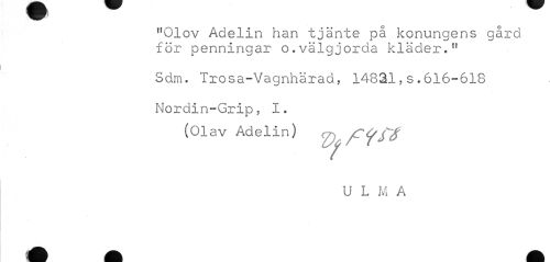 //// 'M Hl //// !f01ov Adelin han tjänte på konungens gård för penningar o.välgjorda kläder." //// Sdm. Trosa-Vagnhärad, 14831,s.616-618 //// Nordin-Grip, I. //// (Olav Adelin) ,c //// U L M A ////