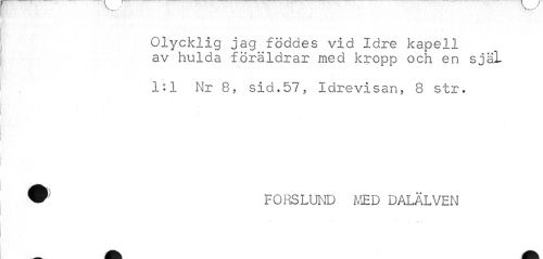 //// Olycklig jag föddes vid Idre kapell av hulda föräldrar med kropp och en själ //// 1:1 Nr 8, sid.57, Idrevisan, 8 str. ® FORSLUND MED DALÄLVEN ////