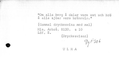 //// ¦ //// "Om alla berg å dalar vore ost och brö å alla sjöar voro brännvin-" //// (Gammal dryckesvisa med mel) Hls, Arbrå, 8120, s 10 //// Löf, E. //// (Dryckesvisor) U L M A ////