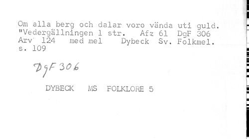 //// Om alla berg och dalar voro vända uti guld. "Vedergällningen 1 str. Afz 61 DgF 306 Arv' 124 med mel Dybeck Sv. Folkmel. s. 109 [ //// DYBECK MS FOLKLORE 5 E ////