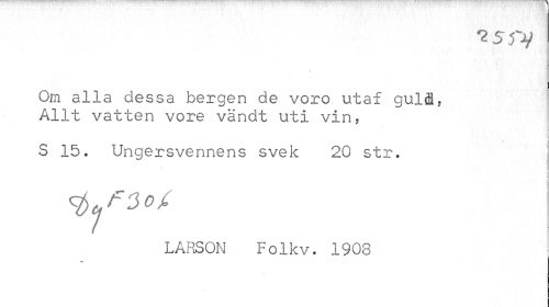 //// Om alla dessa bergen de voro utaf gulå, Allt vatten vore vändt uti vin, //// S 15. Ungersvennens svek 20 str. //// LARSON Folkv. 1908 ////