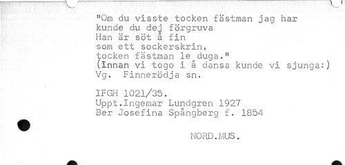 //// u0m du visste töcken fästman jag har //// kunde du dej förgruva //// Han är söt å fin //// som ett sockerskrin, //// töcken fästman le duga." //// (innan vi togo I å dansa kunde vi sjunga:) Vg. Finnerödja sn. //// IFGH 1021/35. //// Uppt.Ingemar Lundgren 1927 Ber Josefina Spångberg f. 1854 //// ^ NORD.MUS. ////