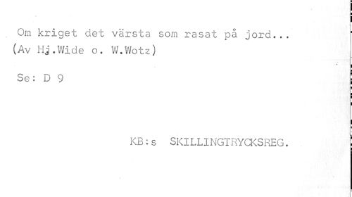 //// i //// . Om kriget det värsta som rasat på jord... (Av Hj.Wide o. W.Wotz) //// I //// Se: D 9 j //// KB: s SKILLINGTRYCKSREG. . j ////