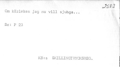 //// jsn //// Om kärleken jag nu vill sjuhga... Se: P 23 //// KB:s SKILLINGTRYCKSREG. ////