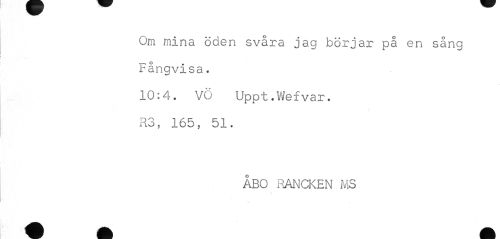 //// Om mina öden svåra jag börjar på en sång Fångvisa. //// 10:4. Vö Uppt. V/ef var. R3, 165, 51. //// ÅBO RANCKEN MS ////