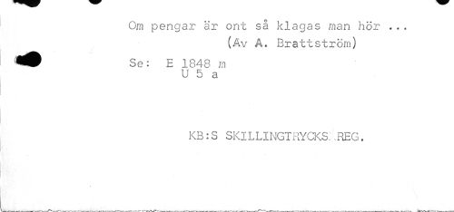 //// Om pengar är ont så klagas man hör ... //// (Av A. Brattström) //// Se: E 1848 m //// U 5 a //// KB:S SKILLINGT RYCKS; .REG. //// ---.VN^.^-.^s,---r-W^^,-------___ ////