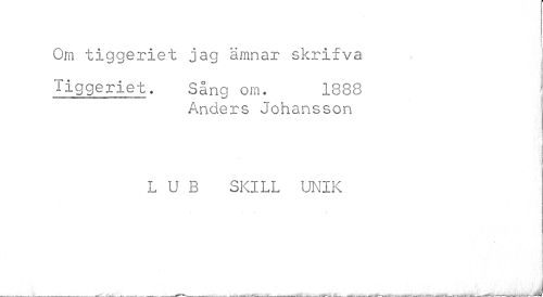 //// Om tiggeriet jag ämnar skrifva //// Tiggeriet. Sång om. 18S8 //// Anders Johansson //// • i //// L U B SKILL UNIK //// , ... . ..._. . .. ... .,.. ////