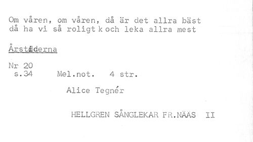 //// Om våren, om våren, då är det allra bäst då ha vi så roligt k och leka allra mest //// o //// Årstiderna Nr 20 //// s.34 Mel.not. 4 str. //// Alice Tegnér //// HELLGREN SÅNGLEKAR FR.NÄAS II ////