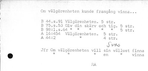 //// Om välgörenheten kunde framgång vinna... //// B 44,5.91 Välgörenheten. 5 str. B 75,s.53 Giv din skärv och tig. 5 str. B 98:1,s.64 " " " " « 5 str. A 16:454 Välgörenheten. 5 str. A 44:2 « 4 str. //// Jfr Om välgörenheten vill sin vällust finna 0 " " " en " vinna //// RA ////