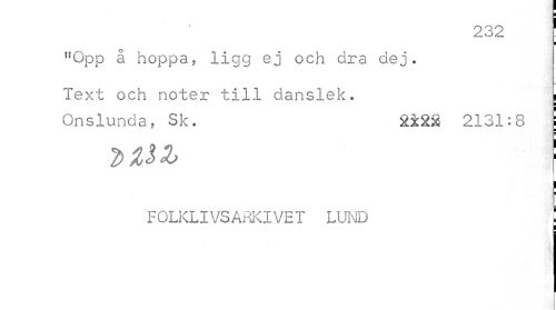 //// 232 1 //// I //// "Opp å hoppa, ligg ej och dra dej. //// Text och noter till danslek. I //// Onslunda, Sk. 2iXä 2131:8 //// i ¦ //// FOLKLIVSARKIVET LUND j ////