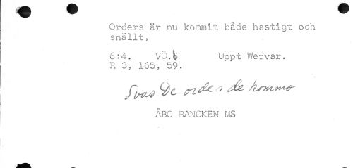 //// Orders är nu kommit både hastigt och snällt, //// 6:4. VÖ.k Uppt Wefvar. //// R 3, 165, 59. //// ÅBO RANCKEN MS ////