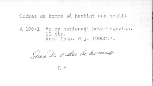 //// Ordres de kommo så hastigt och snällt //// i //// A 186:1 En ny nationa^l beväringsvisa. //// 12 str. //// kom. insp. Rtj. 12062:7. R A ////
