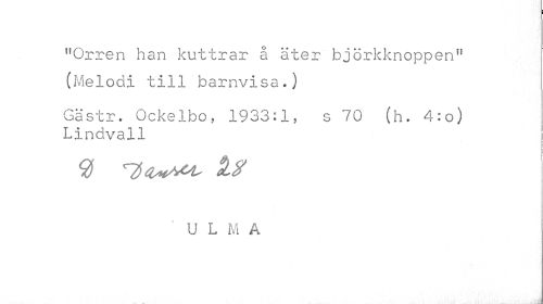 //// "Orren han kuttrar å äter björkknoppen" (Melodi till barnvisa.) //// Gästr. Ockelbo, 1933:1, s 70 (h. 4:o) Lindvall //// U L M A ////