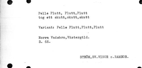 //// Pelle Plutt, Plutt,Plutt tog ett skutt,skutt,skutt //// Variant: Pelle Plutt,Plutt,Plutt //// * //// Norra Vadsbro,Västergtld. S. 66. //// STRÖM,SV.VISOR o.RAMSOR. //// • f ... * ////