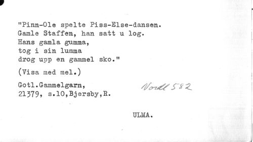 //// i //// ffPinn-01e spelte Piss-Else-dansen. //// t //// Gamle Staffen, han satt u log. //// Hans gamla gumma, //// tog i sin lumma //// drog upp en gammel sko.M //// (Visa med mel.) i //// i //// i //// Gotl.Gammelgarn, ///crr^? //// 21379, s.lO,Bjersby,E. //// •»1 //// i //// ULMA. //// l ////