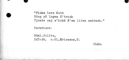 //// ^ "Pi ske Lore Katt //// ^r Stog på logen åf träsk //// Tjente sej efkakä å1en liten smörask." //// - » i !' //// Barnvisor. //// WMi . * //// j fr //// Sdml.Julita, //// 347:46, s.61,Ericsson,G. //// ULMA. //// B - //// * < //// B t ////