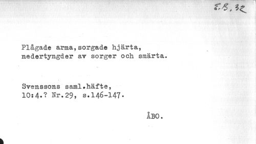 //// Plågade arma, sorgade hjärta, nedertyngder av sorger och smärta. //// Svenssons saml.häfte, //// 10:4*? Nr.29, s,146-147- //// ÅBO. //// i ////