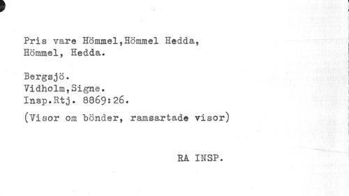 //// r i //// tv I //// Pris vare Hömmel, Hömmel Hedda, //// Hömmel, Hedda. //// * //// i //// i i //// Bergsjö. j //// Vidholm,Signe. j //// Insp.Rtj. 8869:26. I //// (Visor om bönder, ramsartade visor) 1 //// i //// RA IMSP. ////