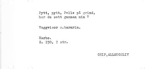 //// Pytt, pytt, Pelle på grind, har du sett gumman min ? //// Vaggvisor o.barnrim. Harbo. //// S. 230, 2 str. //// GRIP,ALLMOGELIV ////