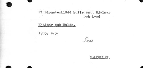 //// På blomsterklädd kulle satt Hjalmar //// och kvad //// % //// » //// Hjalmar och Hulda. //// % //// 1903, s.3. //// Siw //// DALKULLAS. //// t ////