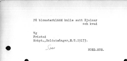 //// På blomstarkladd kulle satt Hjalmar //// och kvad //// Tg" //// Pristad //// Mskpt.,Soldatsånger,B.U.29173- //// Jm^ H0BD.1OTS. ////