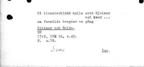 //// På blomsterklädd kulle satt Hjalmar ^^ o ch kvad • ** //// om forntida bragder en gång //// Hjalmar och Hulda. SN //// 17:8, IHE 34, s.49. H. s.78. //// 1 ////