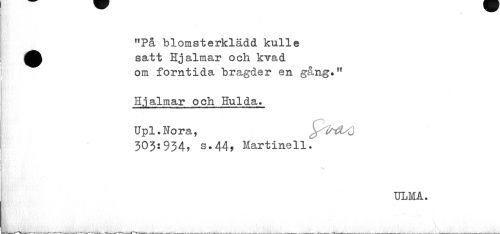 //// "På blomsterklädd kulle ^^ satt Hjalmar och kvad //// om forntida bragder en gång." //// Hjalmar och Hulda. //// Upl.Nora, pMO //// 303:934, s.44, Martinell. //// ULMA. ////