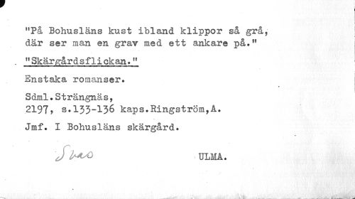 //// r //// ,!På Bohusläns kust ibland klippor så grå, I //// där ser man en grav med ett ankare på." //// • 11 Skär går dsf li ekan." //// i //// Enstaka romanser. //// » //// Sdml.Strängnäs, //// 2197? s.133-136 kaps.Ringström,A. //// Jmf. I Bohusläns skärgård. //// * .t //// SULMÅ. //// » ////